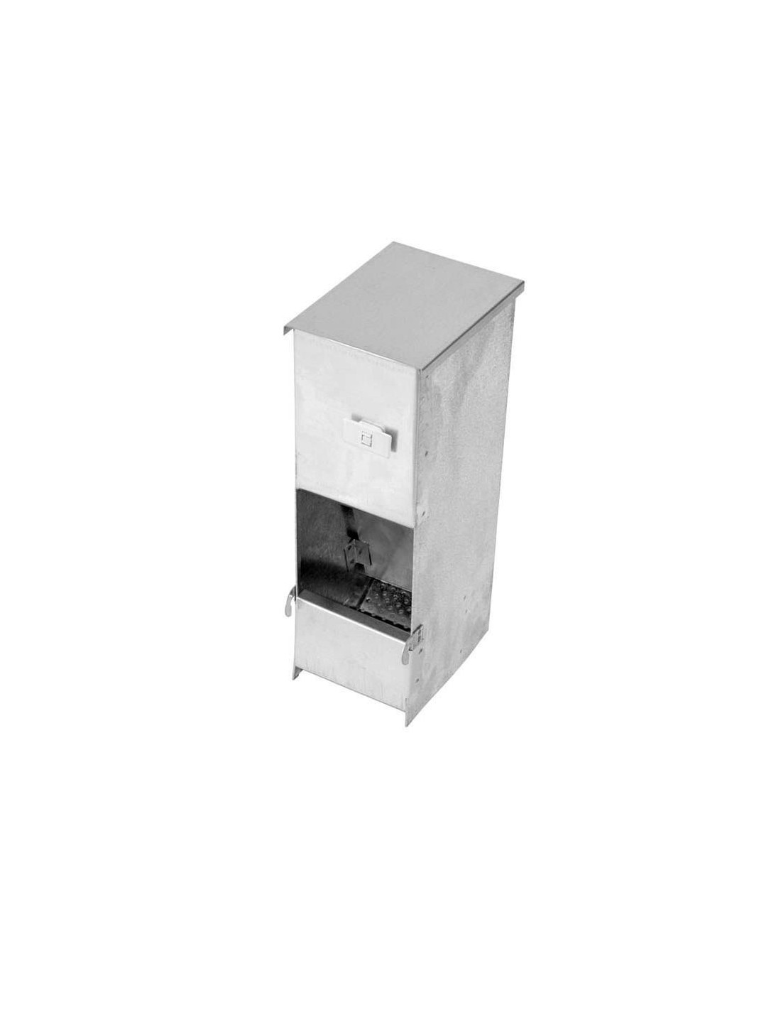 Comedero para conejos fabricado en chapa galvanizada. Su diseño con tapa para instalación en el exterior de la jaula, evita que otros animales puedan comerse el alimento. Incluye presilla y ganchos para fijarla a la jaula, y posee un fondo perforado para evacuar el polvo que contenga el pienso ya que no es bueno que lo ingieran los conejos.