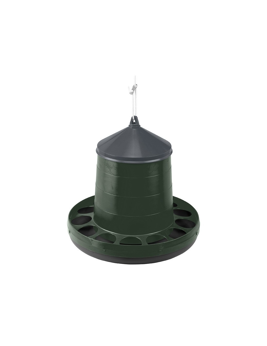 Comedero elaborado con plástico 100% reciclado de gran resistencia. Ideal para gallinas y otras aves. Su diseño permite que sea ligero y se pueda colgar con facilidad. Tapa desmontable con gran apertura superior para el llenado de alimento.