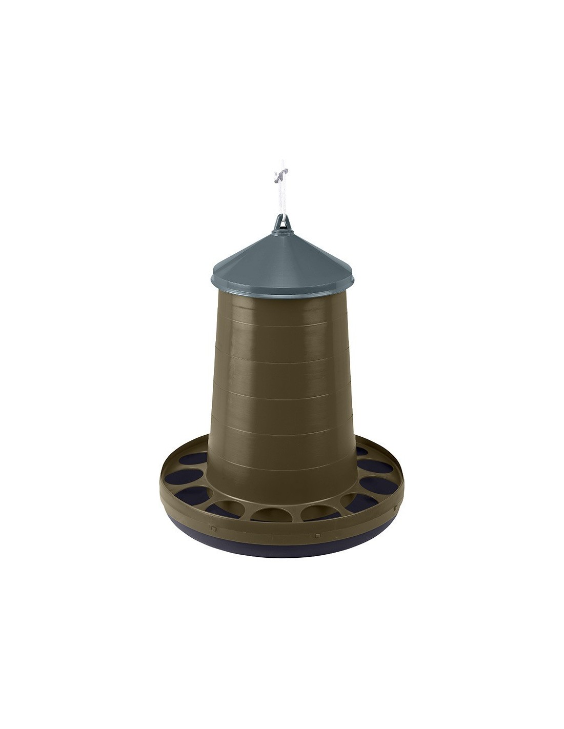 Comedero elaborado con plástico 100% reciclado de gran resistencia. Ideal para gallinas y otras aves. Su diseño permite que sea ligero y se pueda colgar con facilidad. Tapa desmontable con gran apertura superior para el llenado de alimento.