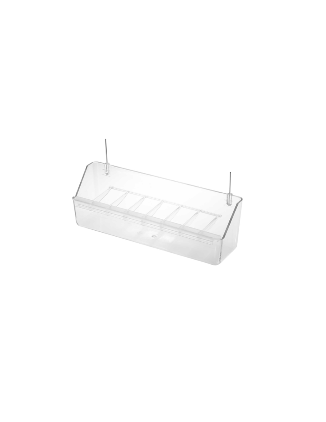 Comedero con ganchos y rejilla superior fabricado en plástico transparente resistente.