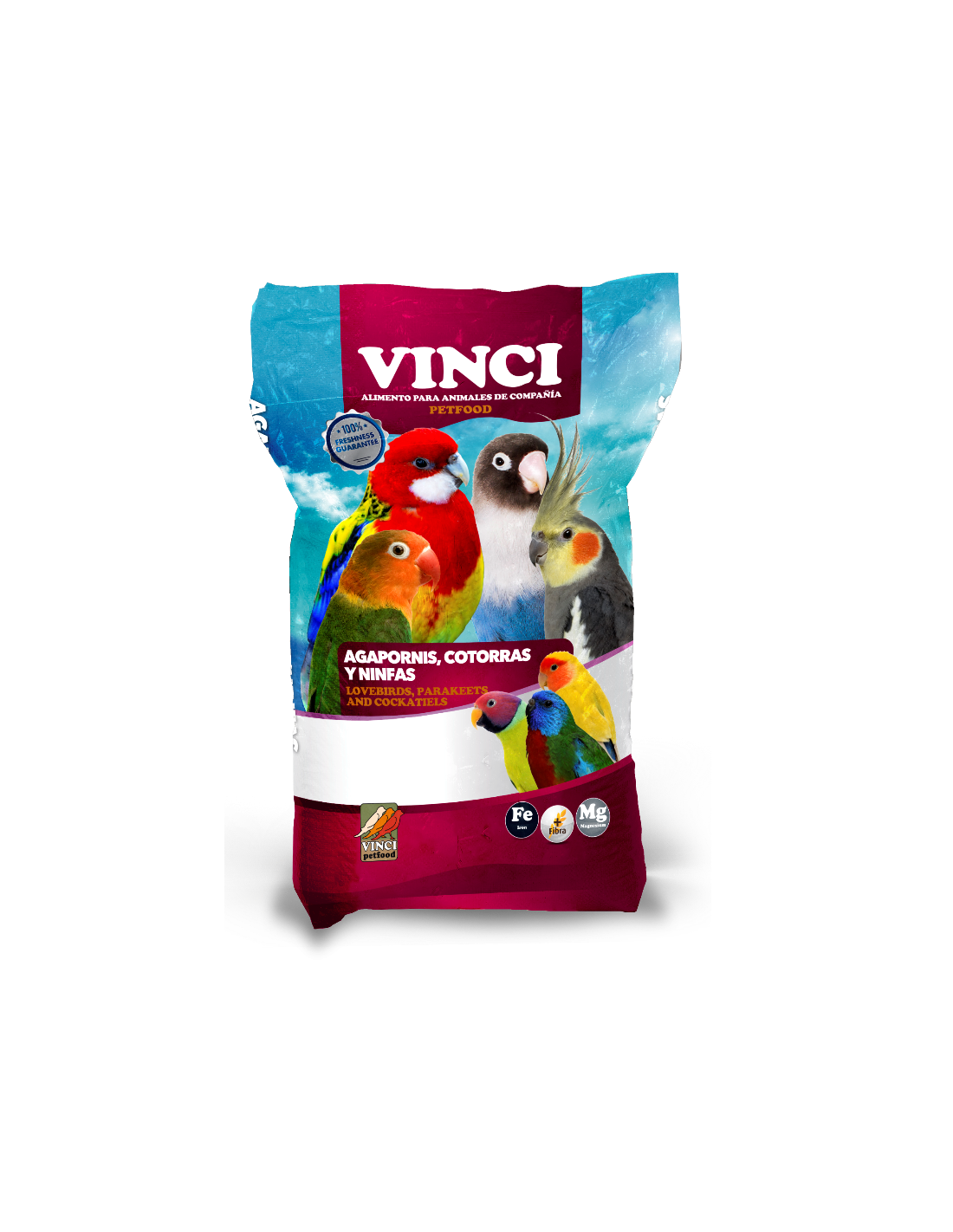 Mijo, semilla de alpiste, avena descascarada, semilla de cártamo, cebada, semilla de cañamón, semilla de lino, trigo, semillas de girasol, aceite mineral y aroma de plátano.