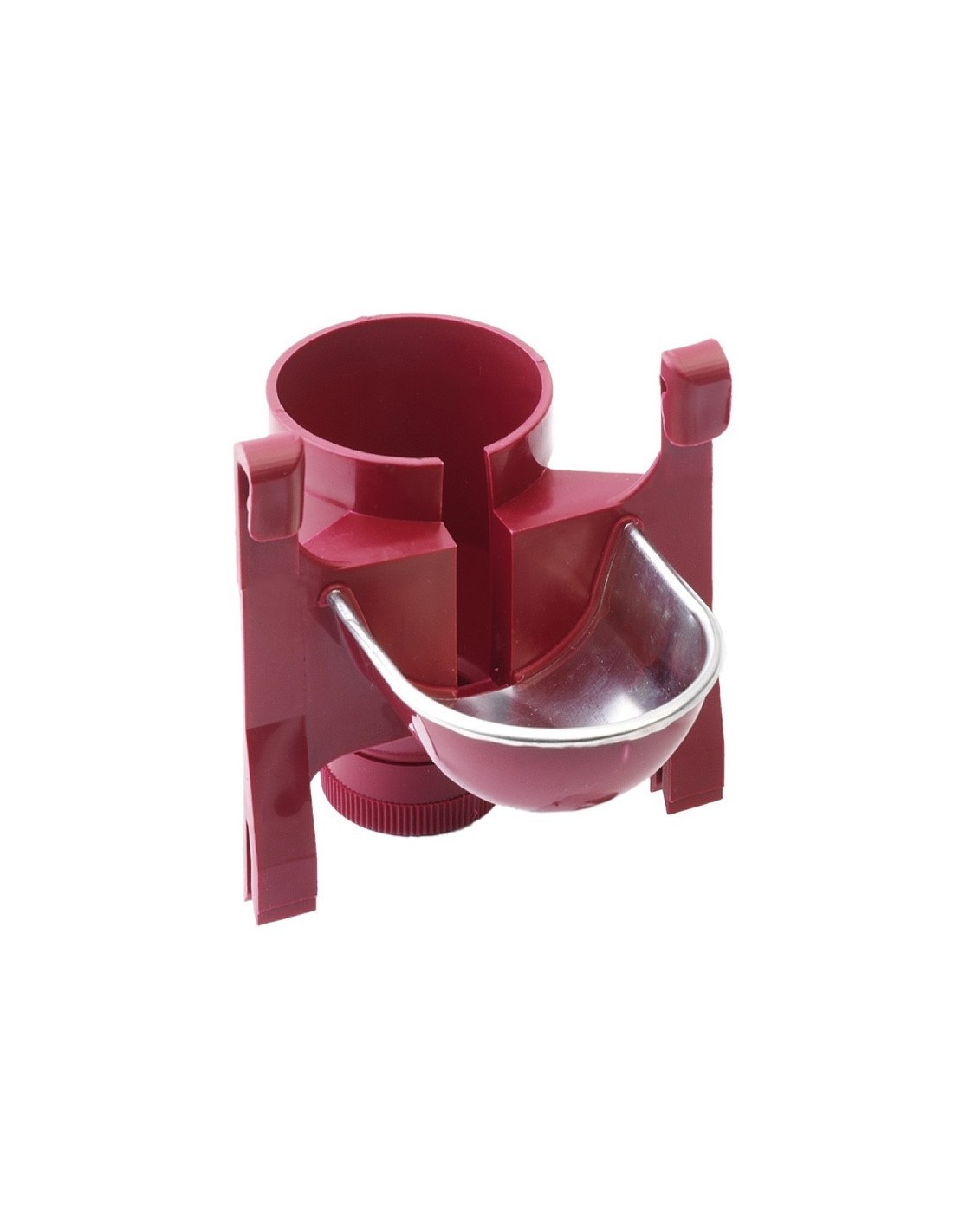 Bebedero automático de plástico para conejos, taza de plástico cubierta con chapa de acero inoxidable, para evitar que puedan morderla o romperla, pestañas elaboradas en plástico para fijarlo en malla de alambre. Adaptable a botella 2 litros Ref. 10295.