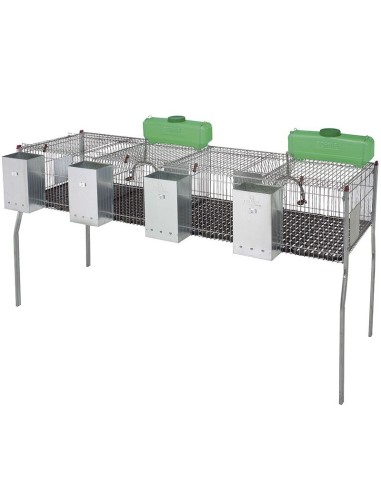 Jaula para conejos con forrajera central de 4 departamentos y de más 2 metros de longitud, totalmente fabricada con chapa galvanizada de alta resistencia, ideal para el engorde de gazapos o para la etapa de maternidad en 4. La jaula para conejos "Penta 4" viene totalmente equipada con tolvas de alimentación y bebederos automáticos para todos sus departamentos.