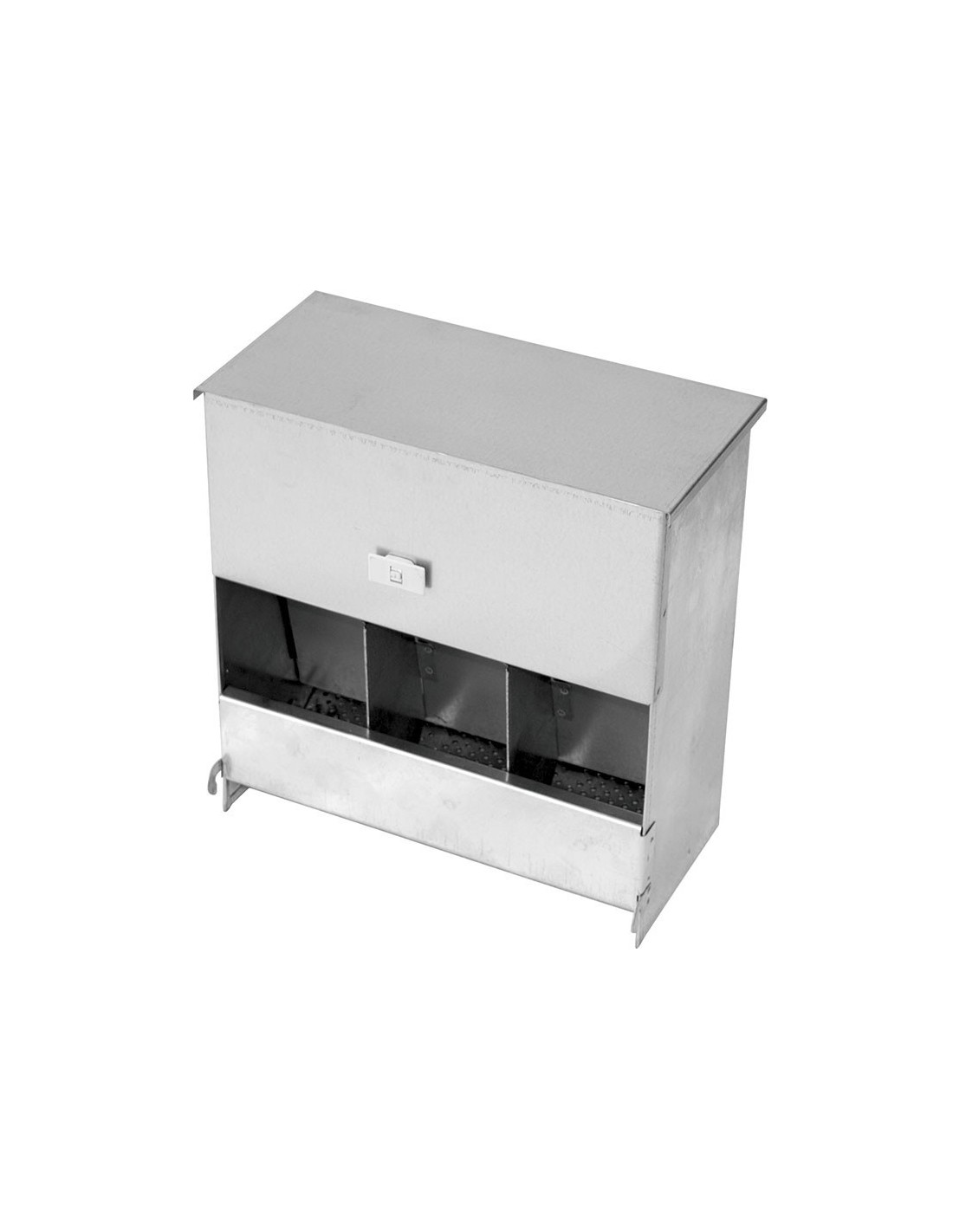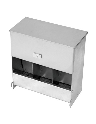 Comedero para conejos fabricado en chapa galvanizada. Su diseño con tapa para instalación en el exterior de la jaula, evita que otros animales puedan comerse el alimento. Incluye presilla y ganchos para fijarla a la jaula, y posee un fondo perforado para evacuar el polvo que contenga el pienso ya que no es bueno que lo ingieran los conejos.