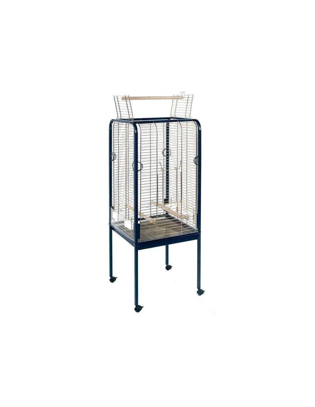 Jaula para loros, dotada con comederos, bebederos y palos. Bandeja y rejilla inferior extraíble, puerta superior y ruedas con freno.