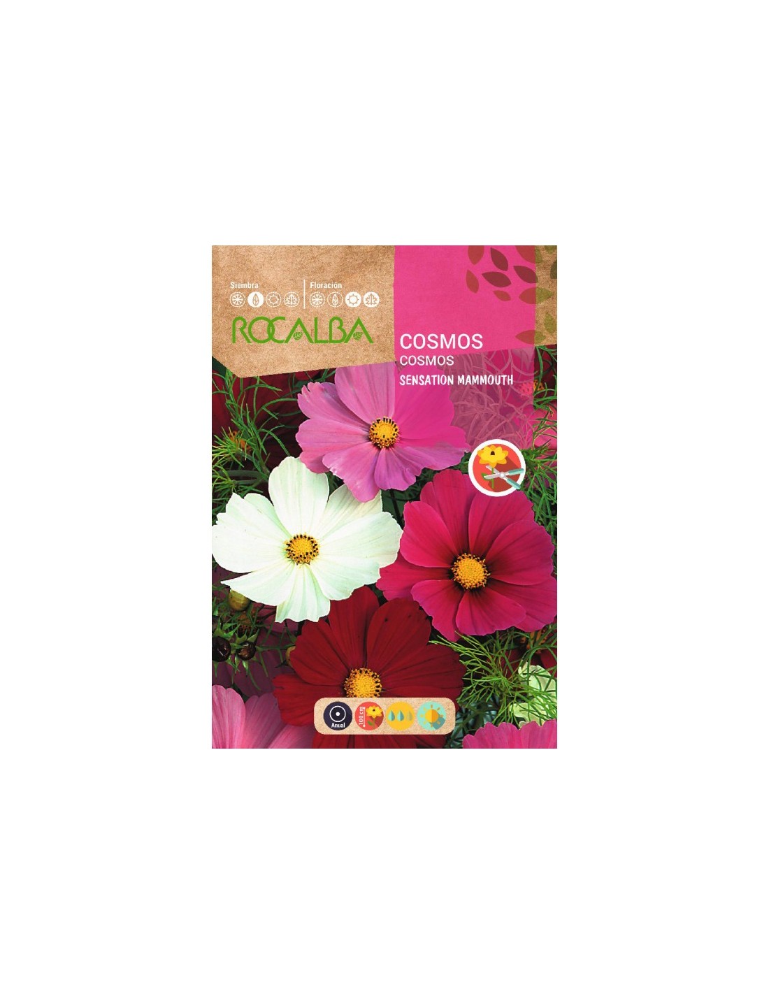El cosmos sensation mammouth gigante variado es una planta herbácea anual de hojas lineares y tallo muy ramificado. Flores de color blanco en cabezuela. Se utiliza para macizos y como flor de cortar.